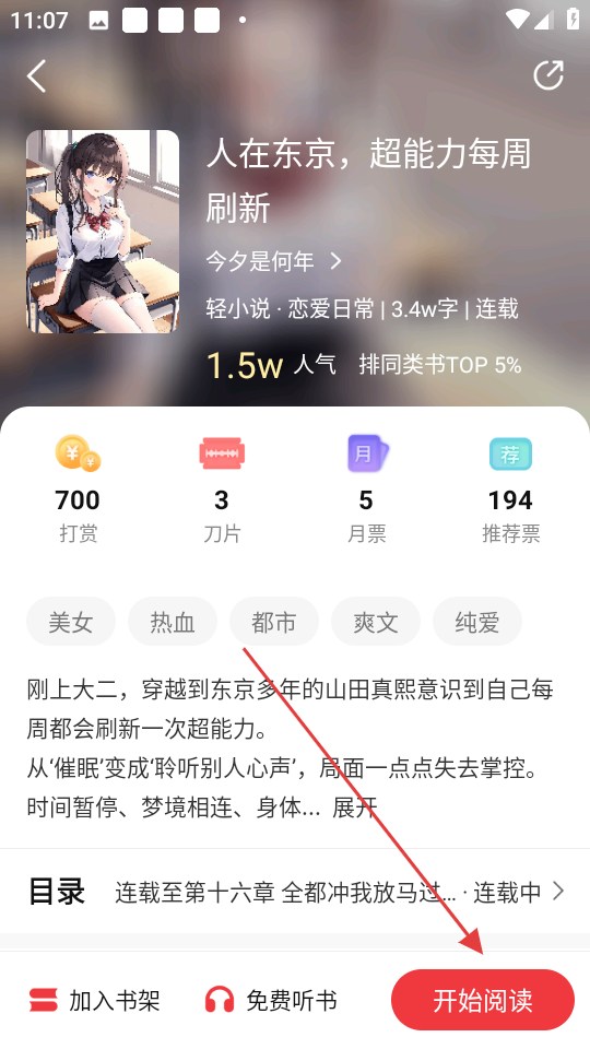 1、在书籍详情页,点击【开始阅读】,可进入阅读页面,开始阅读书籍内容啦。