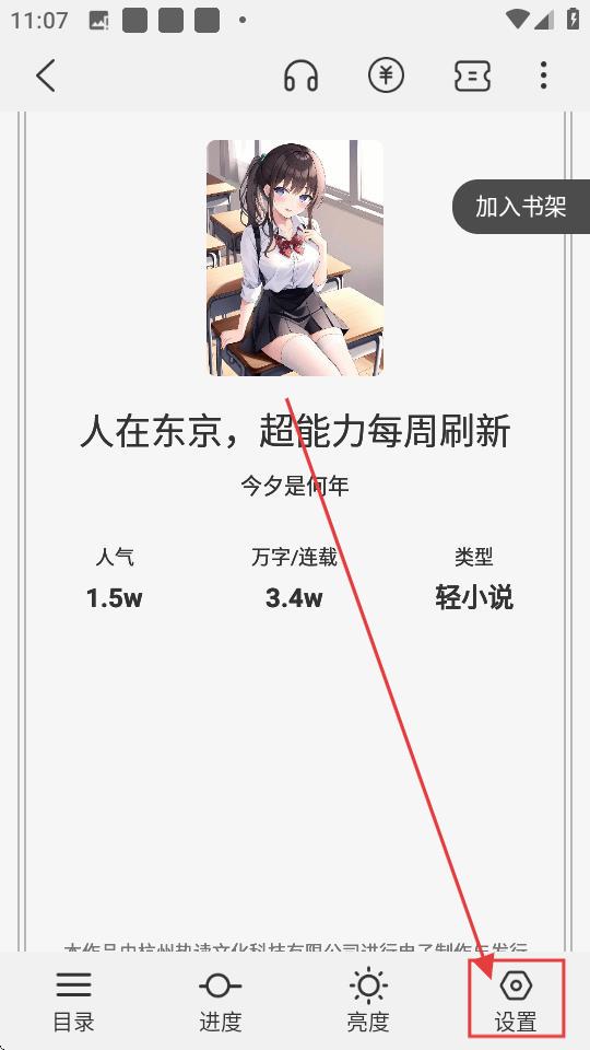 2、进入阅读页面后,点击【设置】,可打开设置选项,调整阅读相关设置哦。