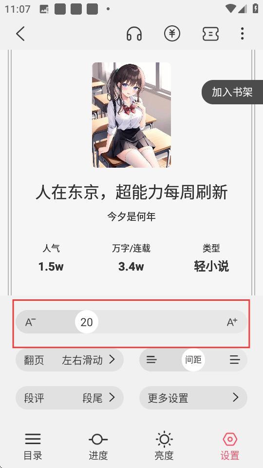 3、在设置选项中,可调整字体大小,通过A-、A+按钮来减小或增大字体啦。