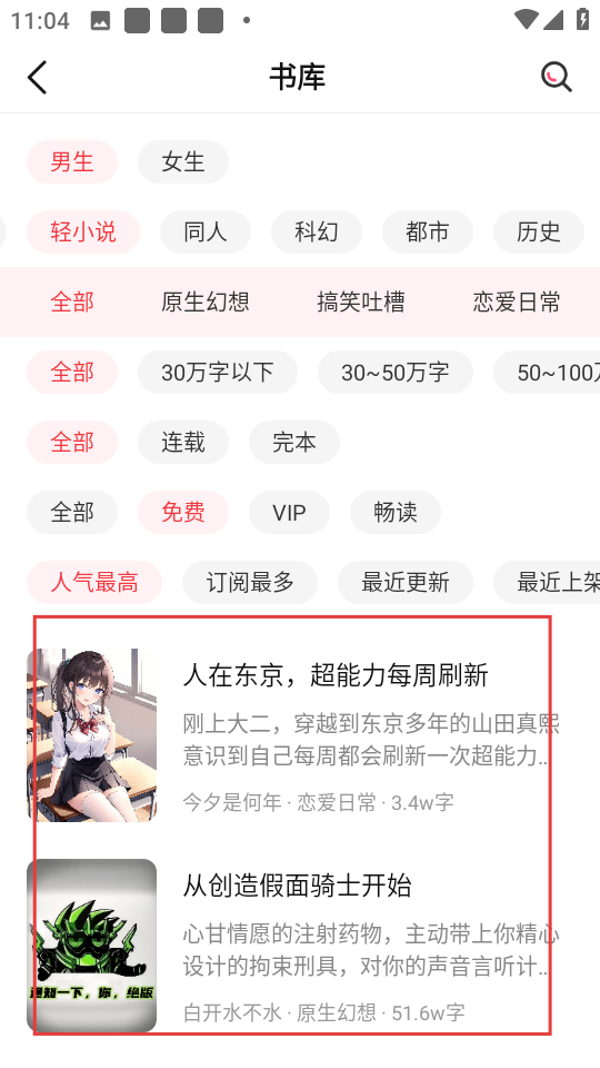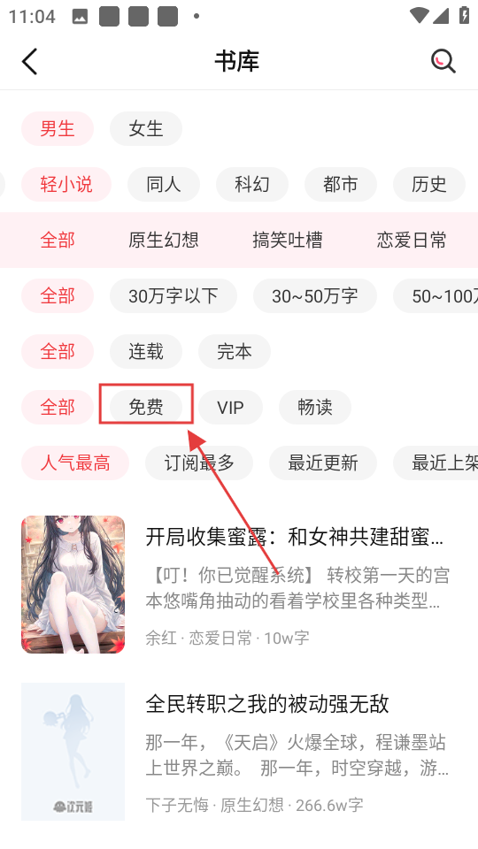 3、书库页点【免费】,筛选出免费轻小说,找书更高效啦。