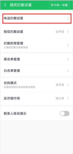 2、在“骚扰拦截”界面选择“电话拦截设置”——“电话拦截返回语音”