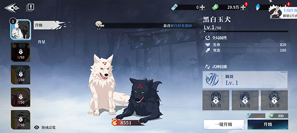 3、式神升星需要消耗对应碎片,升星后可解锁技能,并提升全局属性。