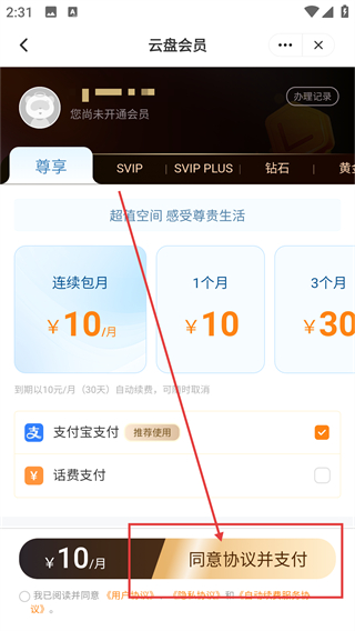 3、在云盘会员页面选好套餐后,勾选协议并点击【同意协议并支付】,就能进入支付流程啦。