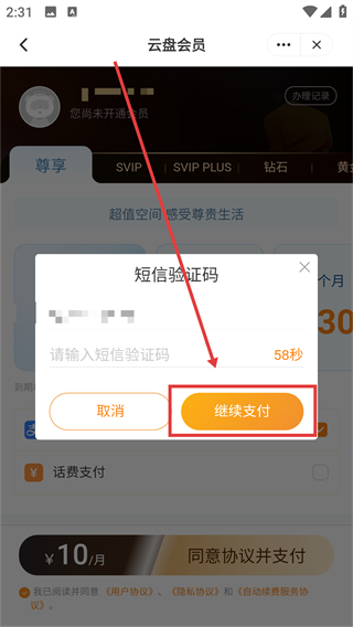 4、支付环节会弹出短信验证码窗口,输入验证码后点击【继续支付】,就能完成会员开通的操作啦。