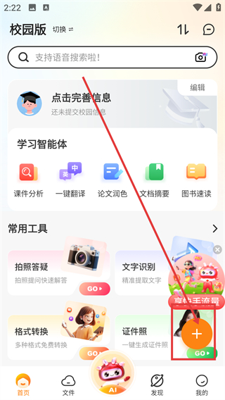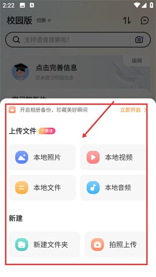 1、在校园版首页点击右下角的加号按钮,就能打开上传选项菜单,准备上传各类本地文件啦。