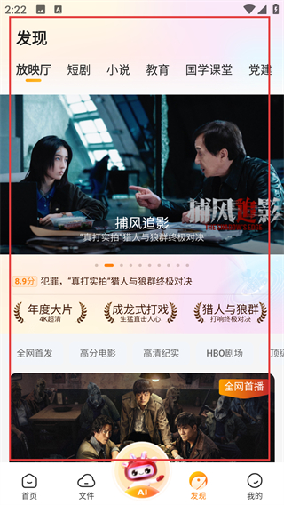 3、点击底部的【发现】选项,就能进入发现页面,在放映厅分类下查看各类影视内容啦。