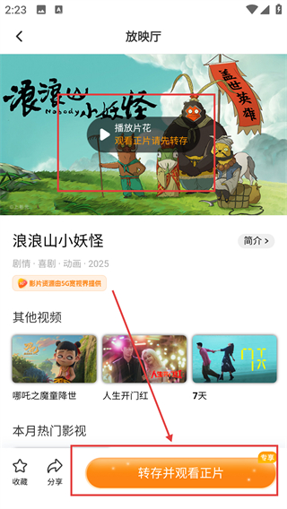 4、在放映厅页面选择想观看的影片,点击【转存并观看正片】按钮,就能转存后观看该影片啦。
