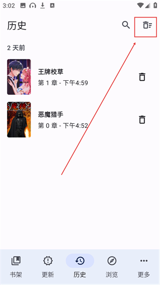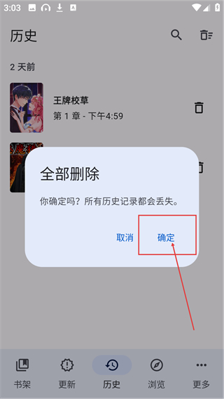 2、进入历史页面后点击右上角删除按钮,就能唤起全部删除的确认弹窗,准备清理历史记录啦。