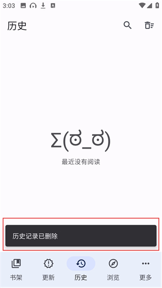 1、在书架页面点击底部【历史】选项,就能进入阅读历史页面,查看之前浏览过的内容啦。