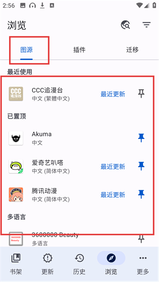 2、进入浏览页面的【图源】栏后,能看到多个资源平台选项,比如【腾讯动漫】,可按需选择哦。
