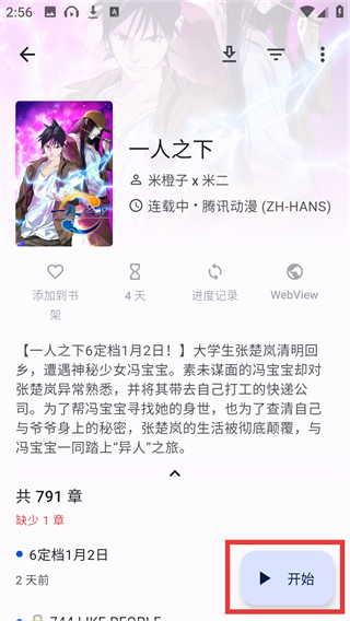 4、在《一人之下》的详情页点右下角的【开始】按钮,就能开启这部作品的阅读啦。