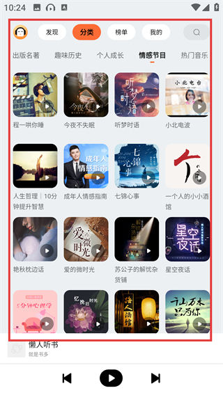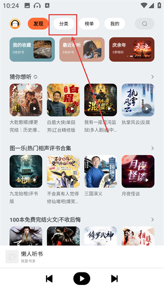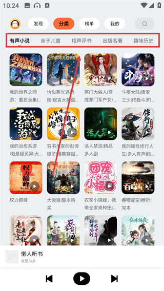 1、在懒人听书的发现页面点击顶部的【分类】选项,就能进入分类页面,按类别筛选想听的内容啦。