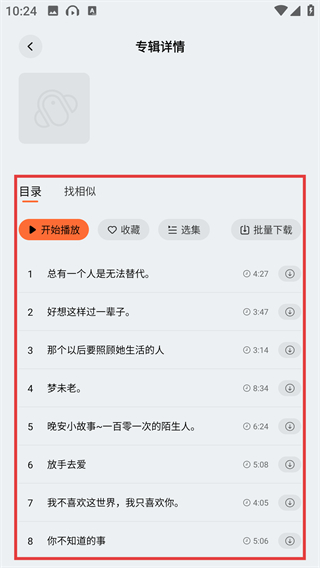 4、进入专辑详情页后,点击【开始播放】按钮就能收听内容,也能进行收藏、选集等操作哦。