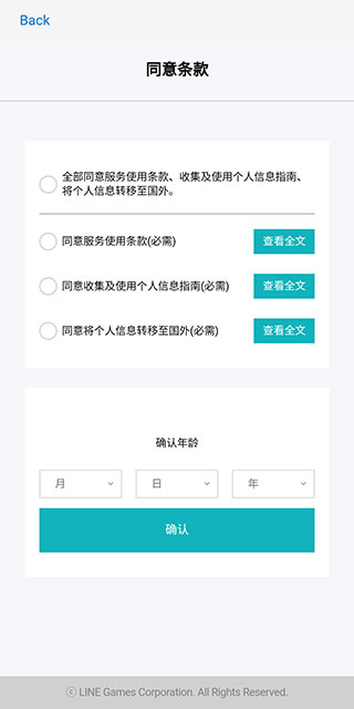 3、然后【勾选同意】全部条款,【设定年龄】后点击【确认】。