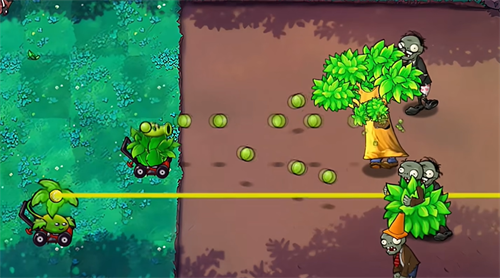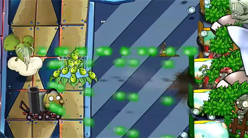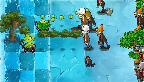 2、在有限的草坪上控制坐着小推车的植物攻击同水平面的僵尸,当然也可以种植在草坪上,小推车可以随意切换你想要种植在草坪上的植物,比如我现在推车上的是豌豆射手,我可以在我种植在草坪上的寒冰射手载上来,让攻击僵尸减速,替换掉的则会留在原地不能移动,实现位置替换。