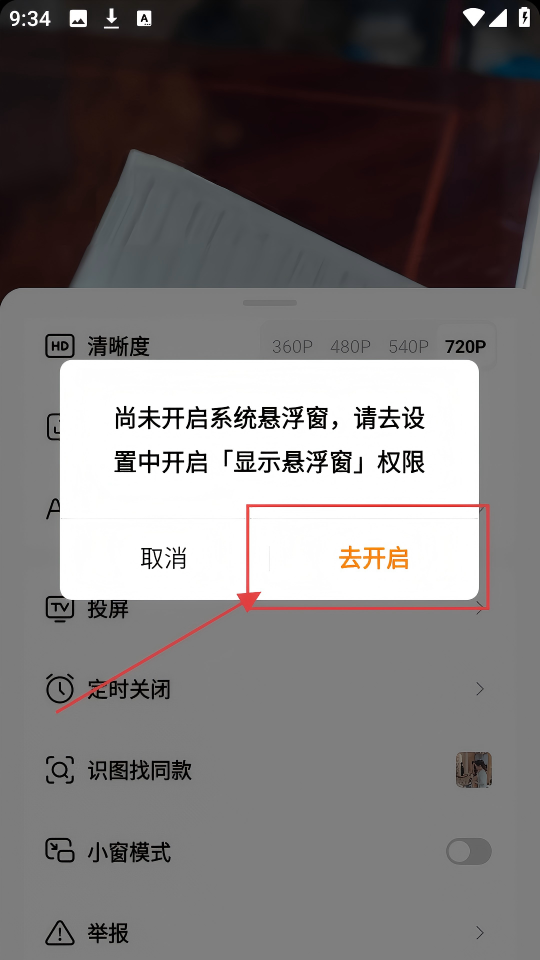 3、若提示未开启系统悬浮窗,点击【去开启】,去设置里开启显示悬浮窗权限就行啦。