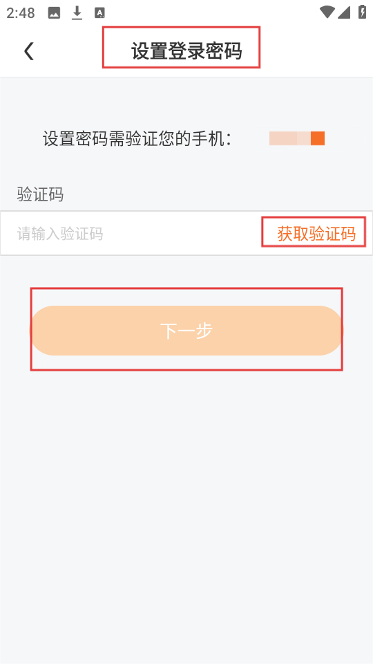 4、进入设置登录密码页面,获取并输入验证码,点击【下一步】,即可继续设置登录密码呢。