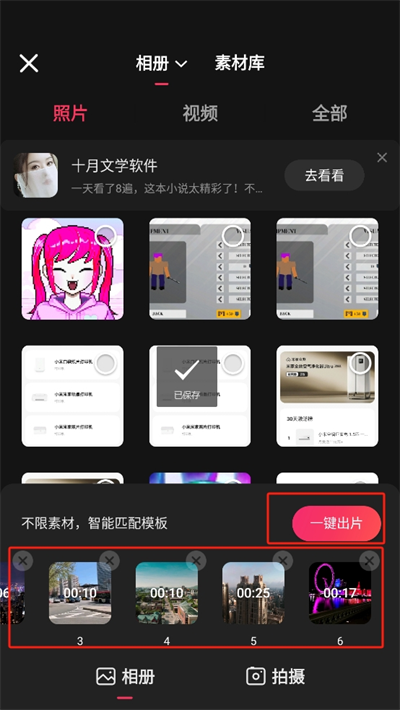 3、当我们选择好想要制作的视频的内容时(支持图片或者短视频两种格式),点击【一键出片】即可自动进行视频内容智能生成处理;