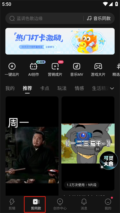1、进入首页后进入【剪同款】栏目中,将会看到各种可以使用的短视频剪辑模板;