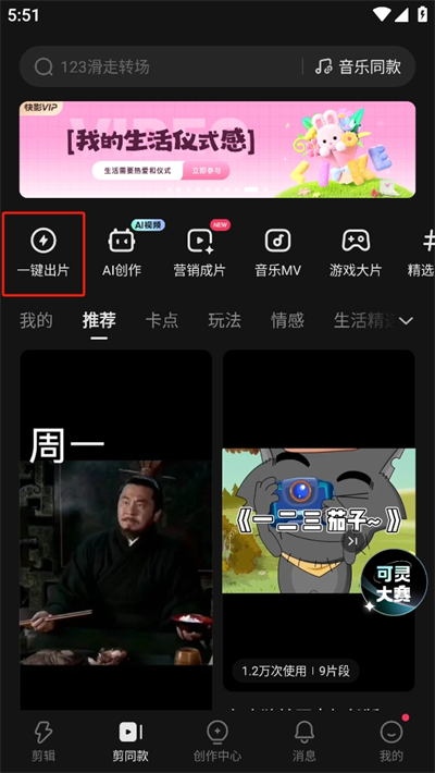 2、为了能够让新手也能轻松的制作出喜爱的视频,选择【一键出片】后根据内容推荐模板;