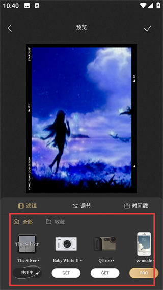 3、选好滤镜后点击【调节】按钮,就能进入该滤镜的参数调整界面,精细调整效果啦。