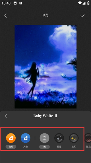 4、进入滤镜调节页面后,可切换不同的效果选项(比如【自动】【人像】),让素材呈现更合适的风格哦。