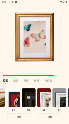 5、这里有着相框、滤镜、背景、编辑、内边框让你选择使用,编辑完成后即可保存了。