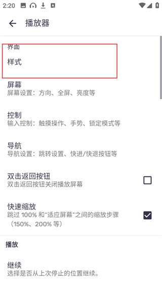 4、在播放器设置页点击【样式】选项,就能调整播放器的界面样式,让播放界面更符合你的使用偏好啦。