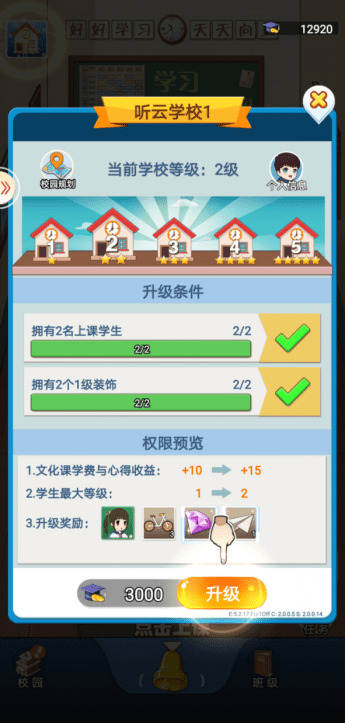 2、在页面底部显示升级所需的经验数量。当您有足够的经验时,您可以点击升级按钮进行升级。在升级后,相应的学费、经验和汗水收入也会增加,但需要注意的是,学生的升级受到学校水平的限制。所以如果你想培养好学生,你的学校实力也必须通过考试。