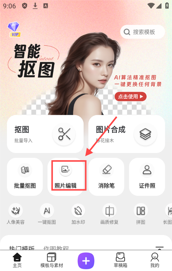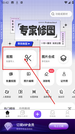 1、在修图工具首页点【抠图】选项,可进入抠图编辑页面,开启对图片主体的分离处理啦。
