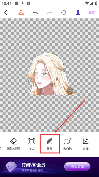 2、进入抠图编辑页后,点底部的【背景】选项,能展开背景设置栏,准备更换图片背景哦。