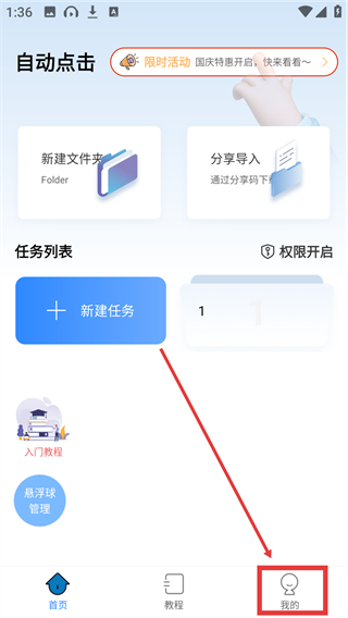 1、在自动点击主界面点底部的【我的】选项,就能进入个人功能页面,后续可调整应用的各类设置啦。