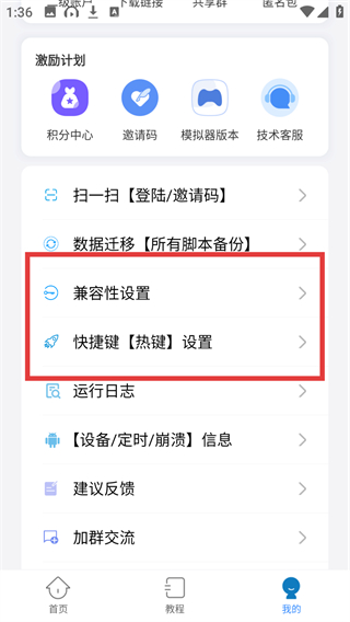 2、进入我的页面后,找到【兼容性设置】和【快捷键设置】选项,可按需进入对应的配置界面哦。