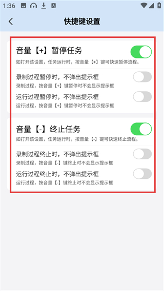 4、在快捷键设置页面,可开启【音量+暂停任务】等功能,用按键快速控制任务的运行状态啦。