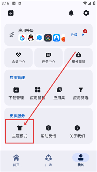 2、进入个人中心后,点击【主题模式】选项,就能进入主题设置页面,调整应用的显示样式哦。