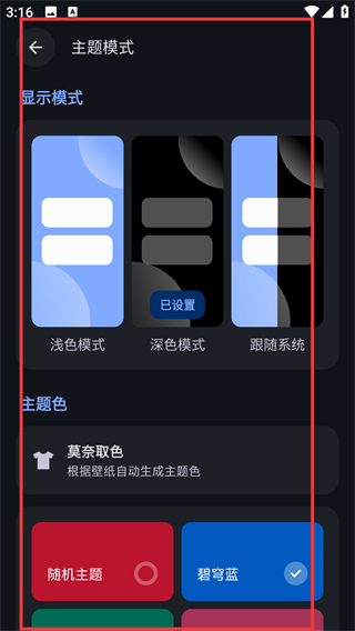 4、选好【深色模式】并确认后,应用界面会切换为深色样式,主题色也会同步适配新显示模式哦。