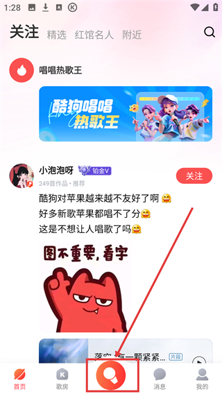 1、打开进入酷狗唱唱app,点击k歌符号;