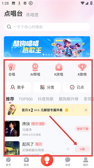 2、进入点唱台后,选目标歌曲旁的【K歌】按钮,能进入该歌曲的演唱准备页面啦。