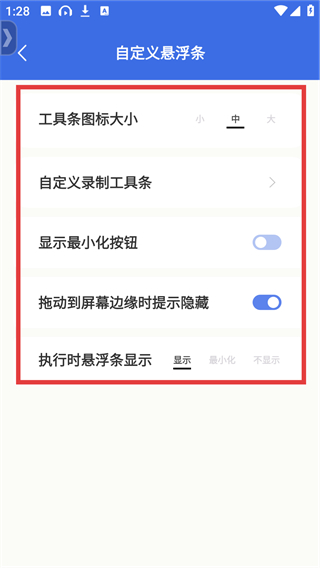 4、进入自定义悬浮条页面后,可调整【工具条图标大小】等参数,让悬浮条更贴合自己的使用习惯哦。