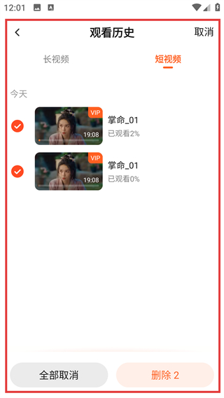4、在编辑模式下勾选要删除的记录,点击底部的【删除2】按钮,就能移除选中的观看历史啦。