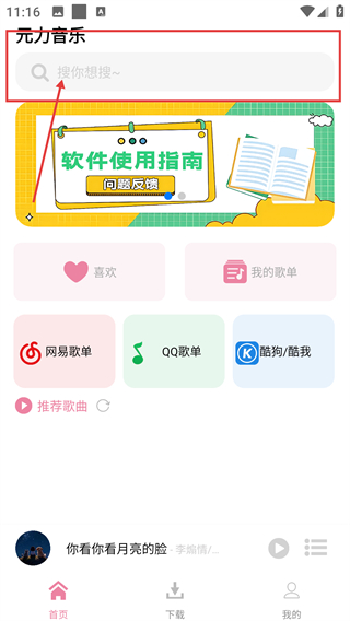 2,在元力音乐的最上方搜索框输入关键字来找歌曲,都是支持在线听歌的
