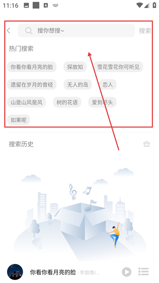 1、在元力音乐的首页,点击顶部的搜索框,可进入搜索页面,查找想要聆听的音乐内容啦。