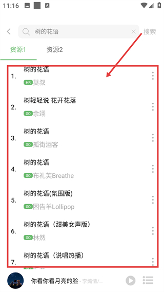 3、搜索结果页面会展示多版本的目标歌曲,选择心仪的版本,就能进入该歌曲的播放界面啦。