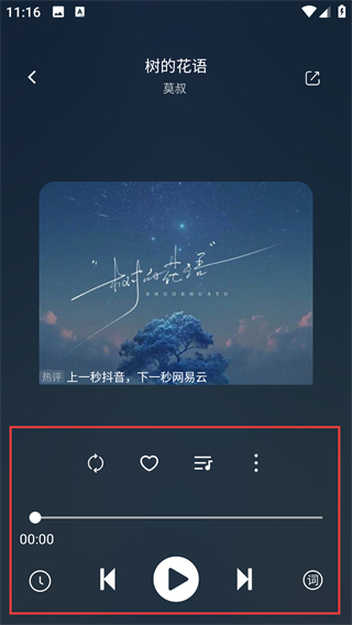 4、在歌曲播放界面,可使用底部的播放控制按钮(如播放、切歌),还能收藏歌曲,享受音乐播放呀。