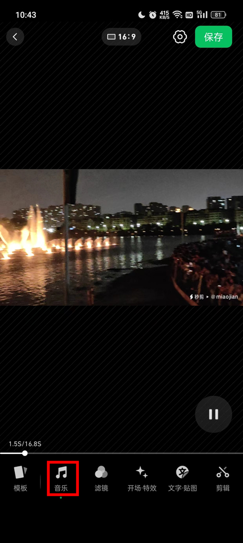 1、添加视频进入到编辑页面之后,选择下方的音乐;