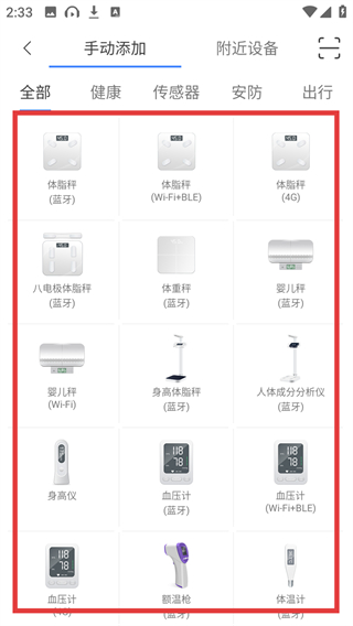 2、进入手动添加页面后,能看到各类设备选项(比如体脂秤-蓝牙),选择目标设备就能准备绑定啦。