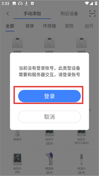 3、选择设备后会弹出登录提示框,点击【登录】按钮,就能跳转到账号登录页面完成登录啦。