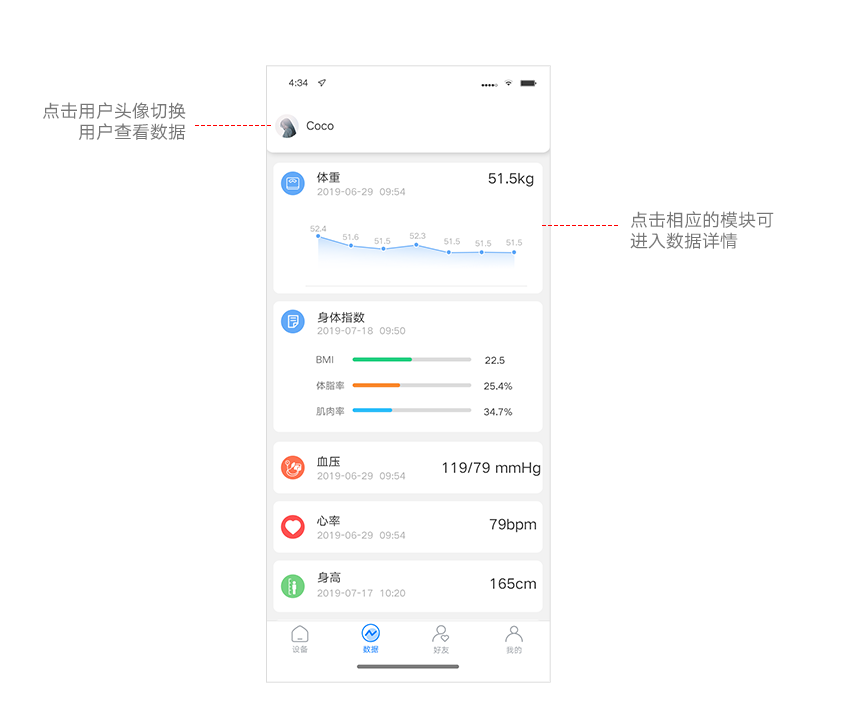 数据功能主要展示和用户相关的测量数据汇总,例如用户有两个体脂秤都产生了同一个用户的体重数据,将统一汇总在数据页面中的同一个用户上,点击相应的数据类型可以查看所有数据汇总。