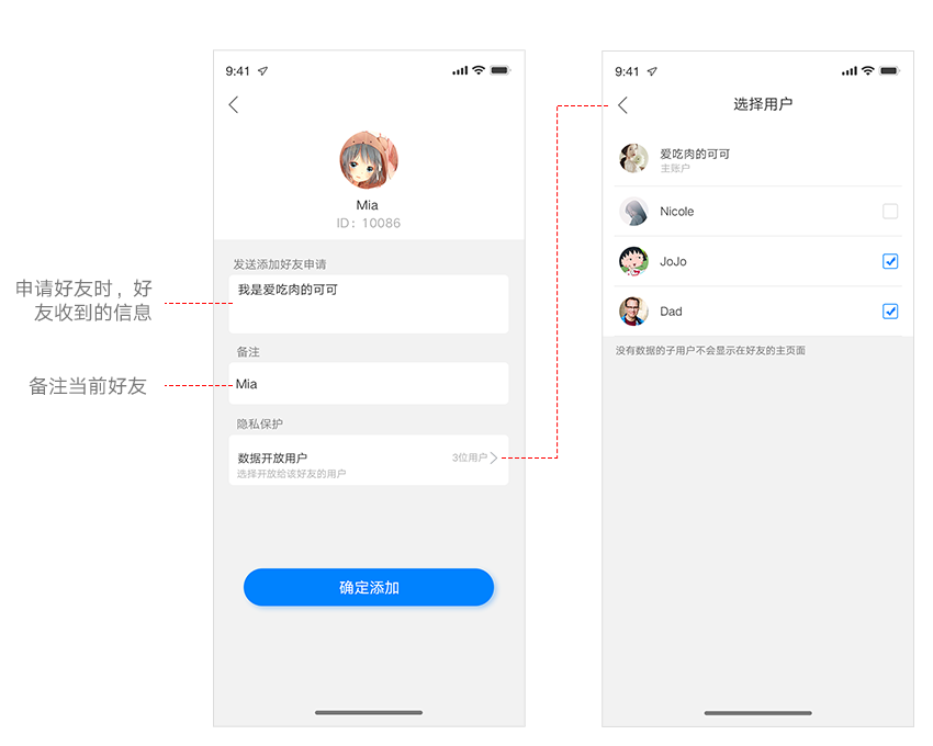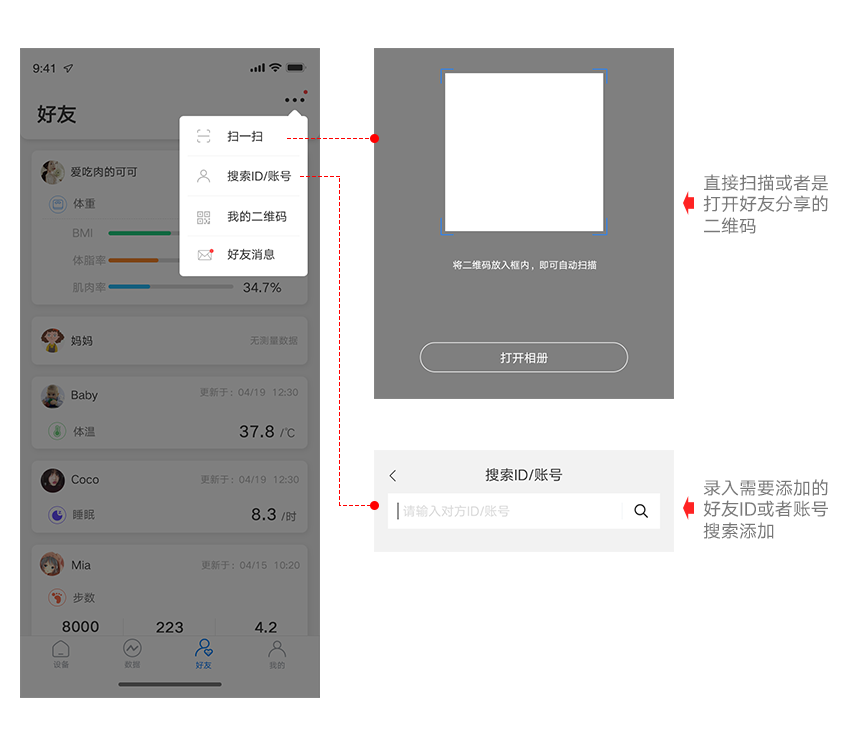 添加好友有两种方法:扫一扫添加、搜索账号ID/账号。通过验证后则成为好友,可以查看开放好友的数据。