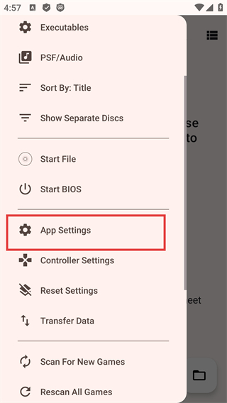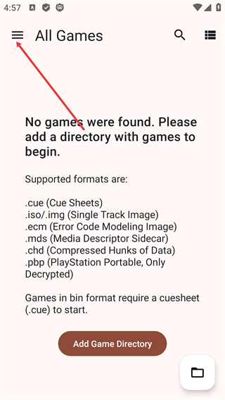 1、在本站下载安装并打开duckstation模拟器,使用手柄连接手机设备之后,点击左上方的三条杠按钮